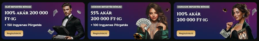 - Befizetés: 100% bónusz 200.000 Ft-ig + 150 ingyen pörgetés (35x wager)